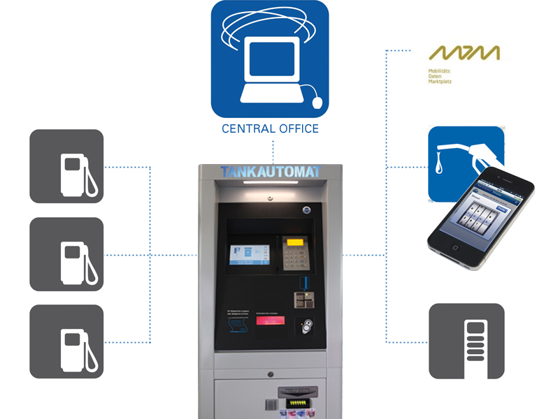 Der Ratio Tankautomat steuert die komplette Tankstelle. Tankkunden bezahlen Ihre Tankungen am Tankautomaten mit Giro-, Kredit-, Stations- oder Flottenkarten. Barzahler bezahlen ihre Tankungen über den Geldscheinleser. Verfügt der Tankautomat über einen Scanner, können Gutscheine eingelöst werden. Die Tankstelle wird vom Firmensitz aus mit Central Office verwaltet. Die Kommunikation zum Tankautomaten erfolgt übers Internet. Zur Umsatzkontrolle der Tankstelle ruft Central Office einmal täglich die Verkaufsergebnisse von Warengruppen und Zahlungsmitteln, Zählerstände, Tankinhalte und die PinPad Clearings ab. Die Treibstoffpreise in der Tankstelle werden vom Central Office gelesen. Diese können geändert und mit Datum und Uhrzeit zum Tankautomaten übertragen werden. Der Tankautomat führt dann zum eingestellten Zeitpunkt die Preisumstellung durch und sendet diese zur Markttransparenzstelle (MDM) Die Tankinhalte der Tankstelle werden vom Central Office gelesen und graphisch dargestellt. Treibstofflieferungen können an den Tankstellen vor Ort oder am Firmensitz im Central Office eingepflegt werden. Central Office und die Tankstellen gleichen die Lieferungen automatisch ab. Zur Kontrolle erstellt Central Office auf der Basis von Lieferungen, Zählerständen und Kundenabrechnungen einen Report. Dies ermöglicht eine lückenlose Kontrolle der Treibstoffe von der Lieferung bis zur Kundenabrechnung. Alarm- und Statusmeldungen, sowie Preisumstellungen werden vom Tankautomaten als SMS, Email oder mit TCP/IP versendet. Preise und Tankinhalte können mit einer Smartphone APP gelesen werden. Die Preise können mit der Smartphone APP auch geändert werden. |