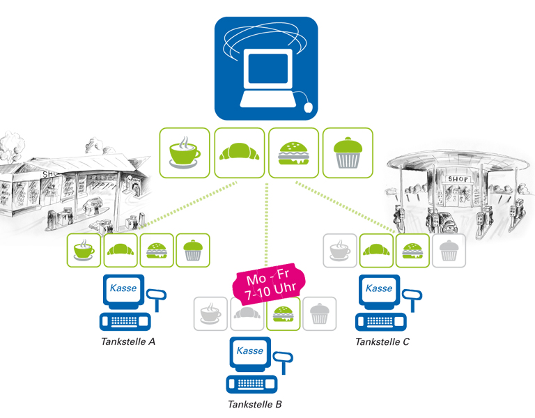 Mit einem Mausclick oder zeitgesteuert werden die Artikel zu den Stationen übertragen. Die Station kann für jeden Artikel wählen, ob sie den Preis aus der Zentrale übernehmen will. Dies ermöglicht es den Stationen sich dem lokalen Marktumfeld anzupassen. Promotion Tool