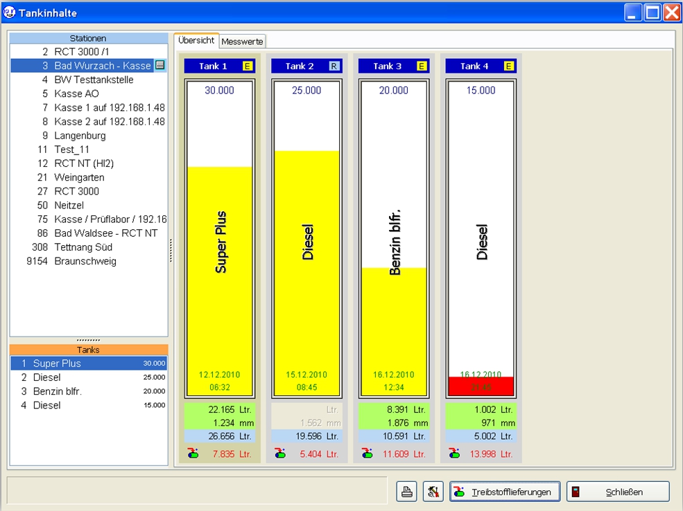 Central-Office beschafft sich aus allen Tankstellen die Tankinhalte und zeigt diese graphisch an. Zur Disposition der Treibstofflieferungen erstellt Central-Office einen Report aller Tankinhalte. Die Treibstofflieferungen können an den Tankstellen oder in der Zentrale eingepflegt werden. Zentrale und Tankstellen gleichen die Lieferungen automatisch ab. |
